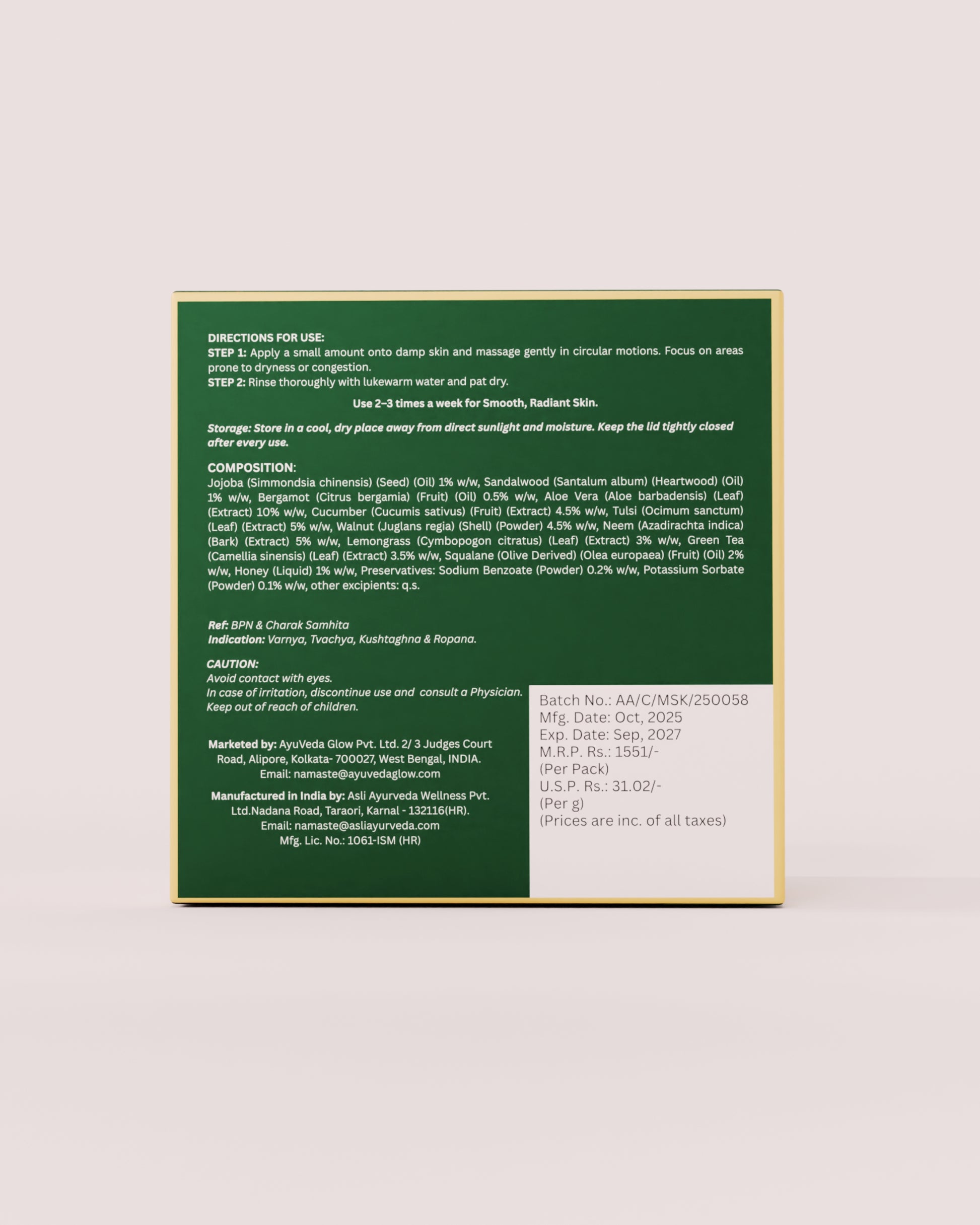 The warmth of Manjistha and the cooling calm of Vetiver bring balance, while Almond Shell softly refines texture for a smooth, illuminated finish. Each application feels like a delicate renewal - removing what the day leaves behind, revealing skin that feels light, fresh, and alive.